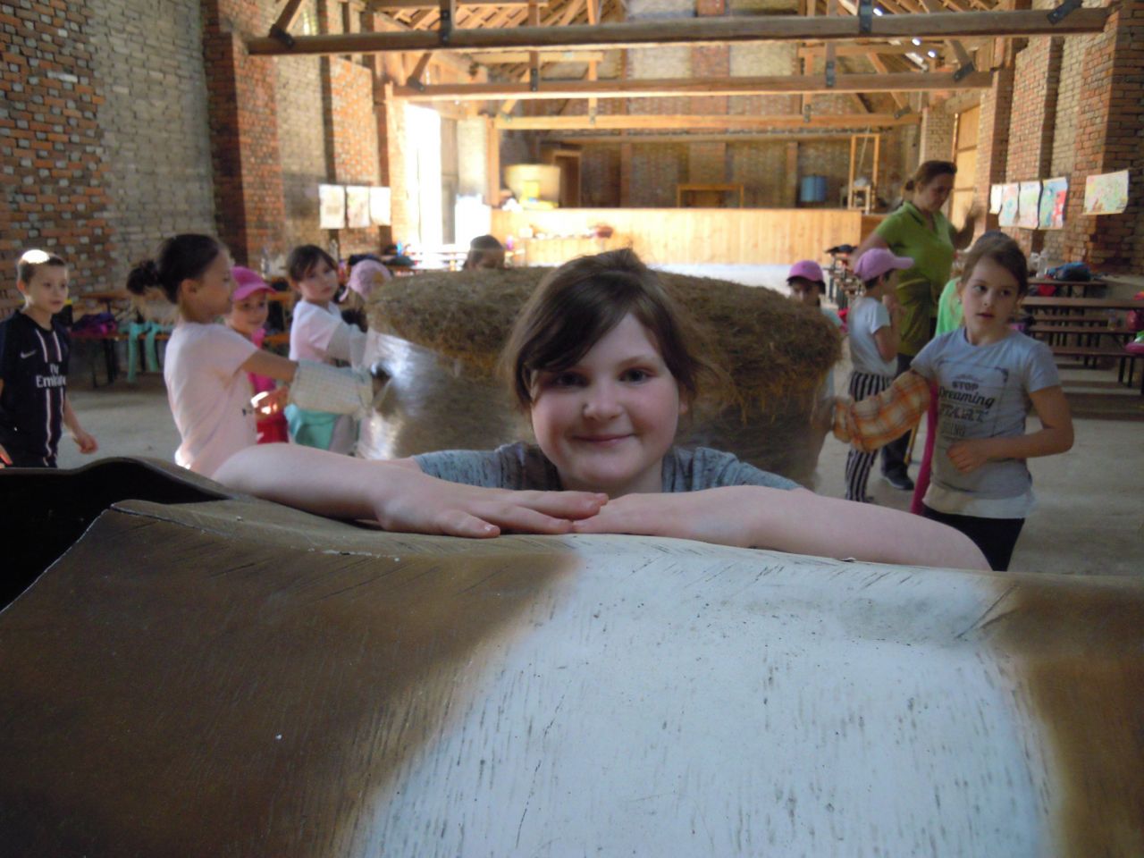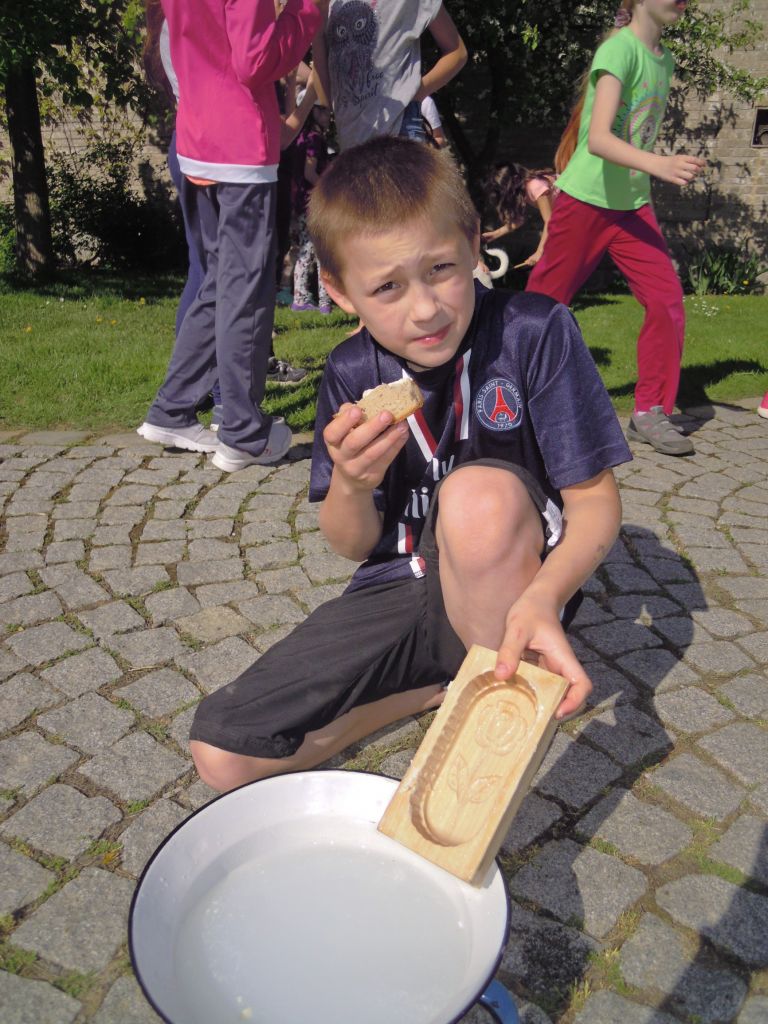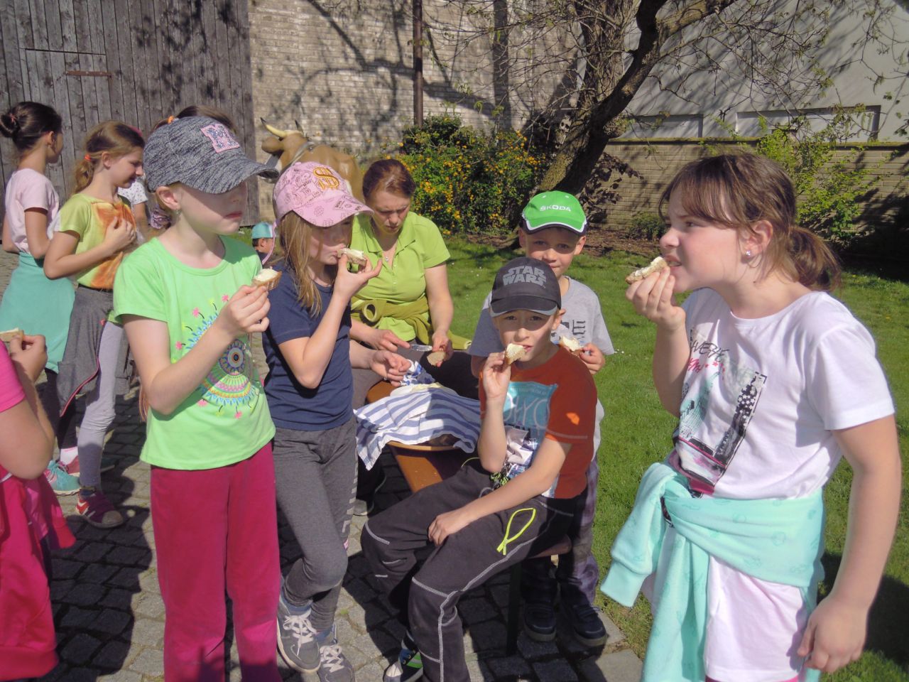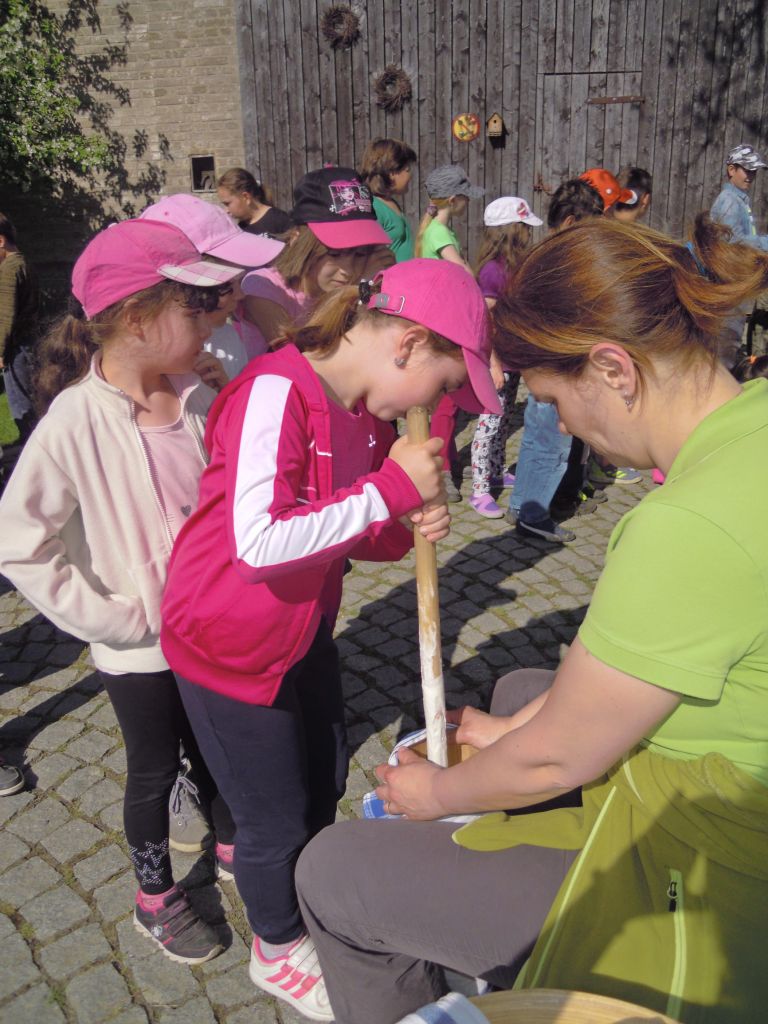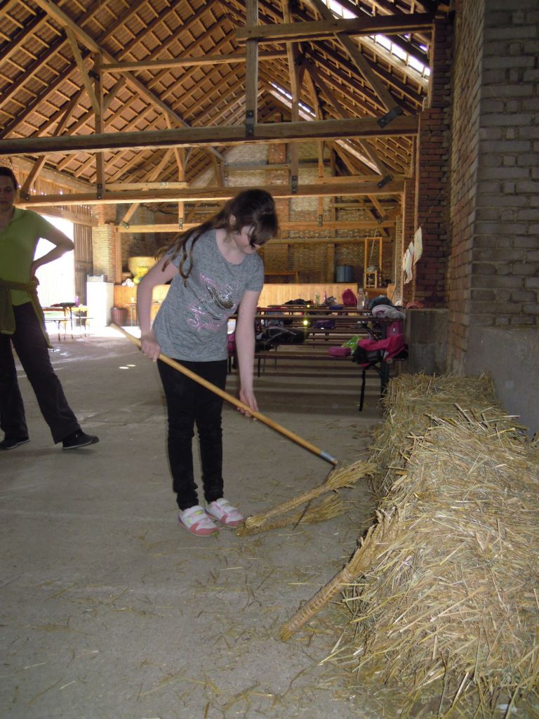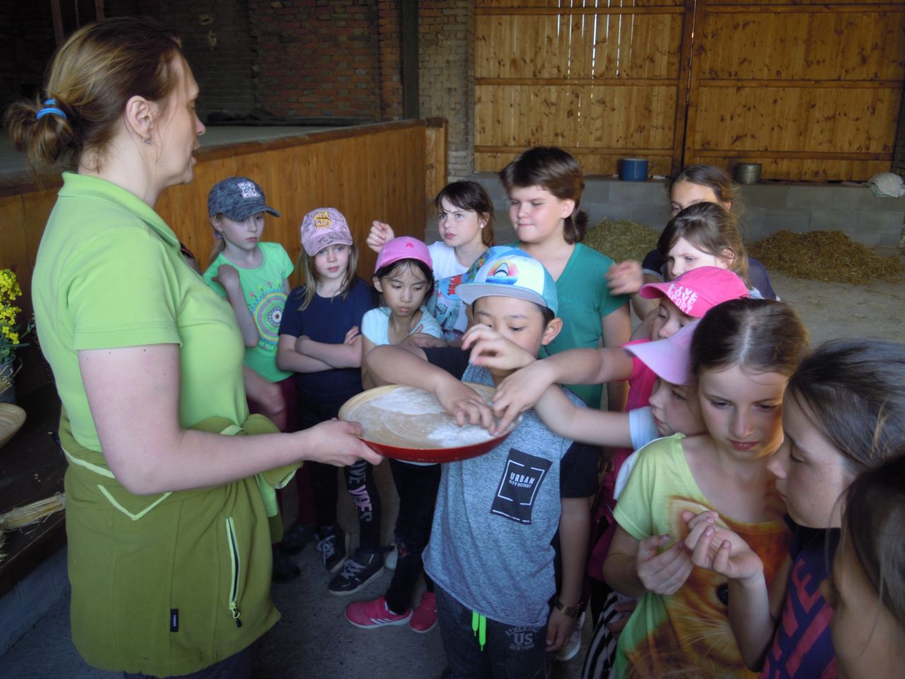 Povídání si o farmaření - hospodářských zvířatech a jejich užitku, pěstování a sklizni plodin, jak se pracovalo v hospodářství dříve a dnes. Děti měly možnost si některé činnosti vlastnoručně vyzkoušet: dojení, stloukání másla v dřevěné máselnici, kosení a mlácení obilí, hmatem poznávat různé obilniny … Velký zájem projevily děti o svezení se na koni.