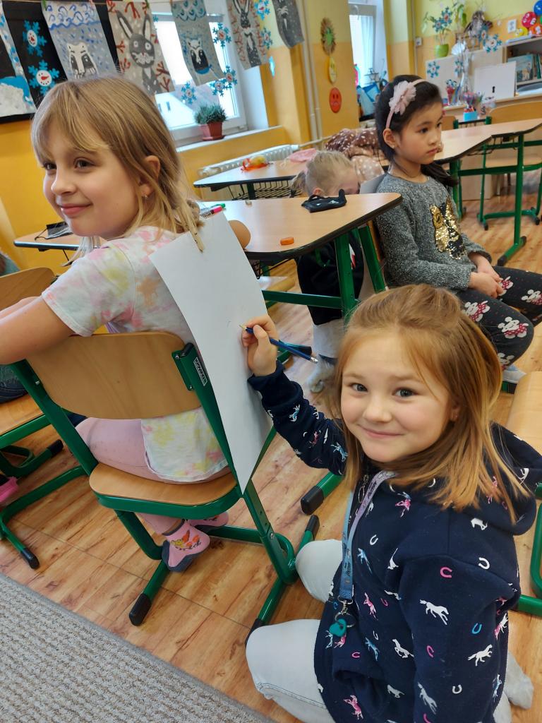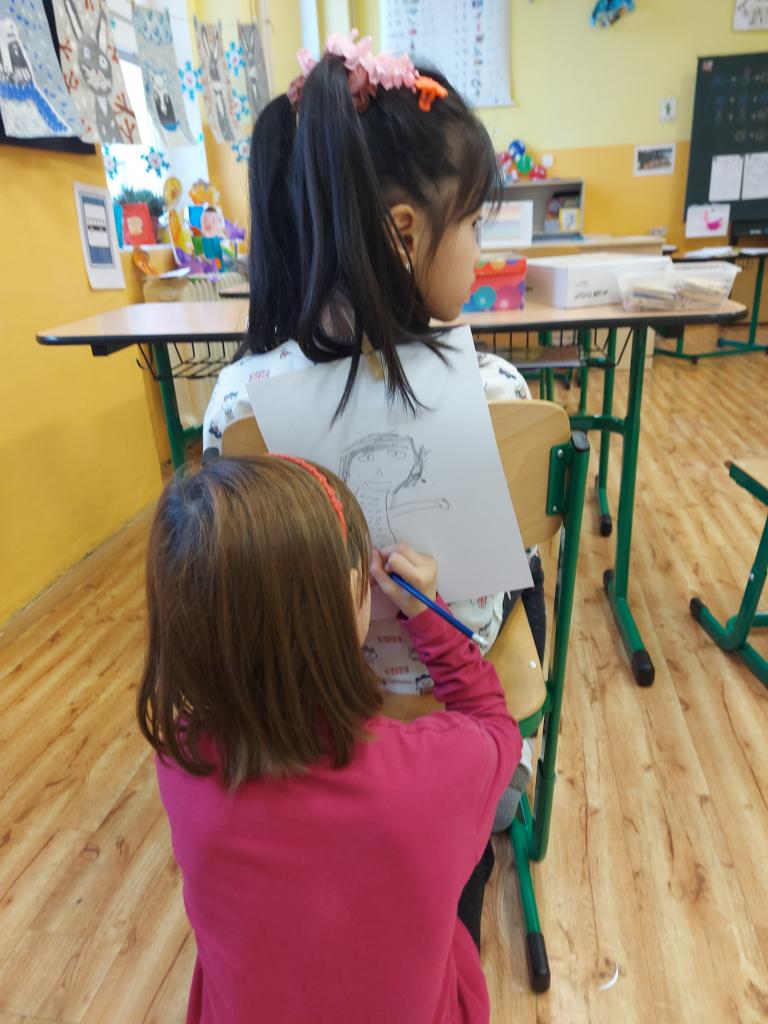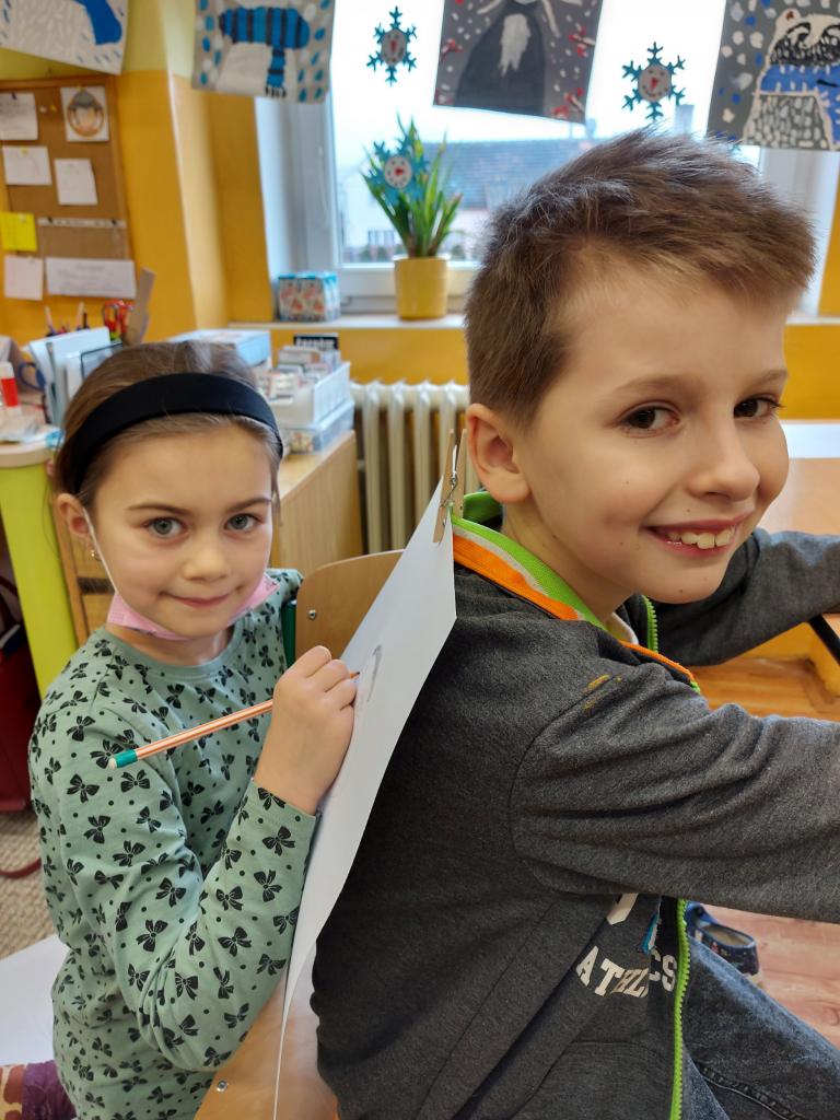 Své dobré kamarády jsme si k sobě otočili zády a připevnili na ně papír. Při kreslení, které nás velmi bavilo, jsme si užili spoustu zábavy a smíchu.