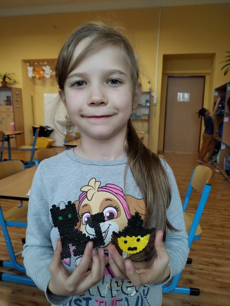 Jako správné čarodějnice jsme míchaly lektvary, pekly nejen hadí ocásky, vymýšlely zaříkávadla, vyráběly masky, tančily, malovaly a z nažehlovacích korálků vyráběli své pomocníky – kočku, pavouka, netopýra…