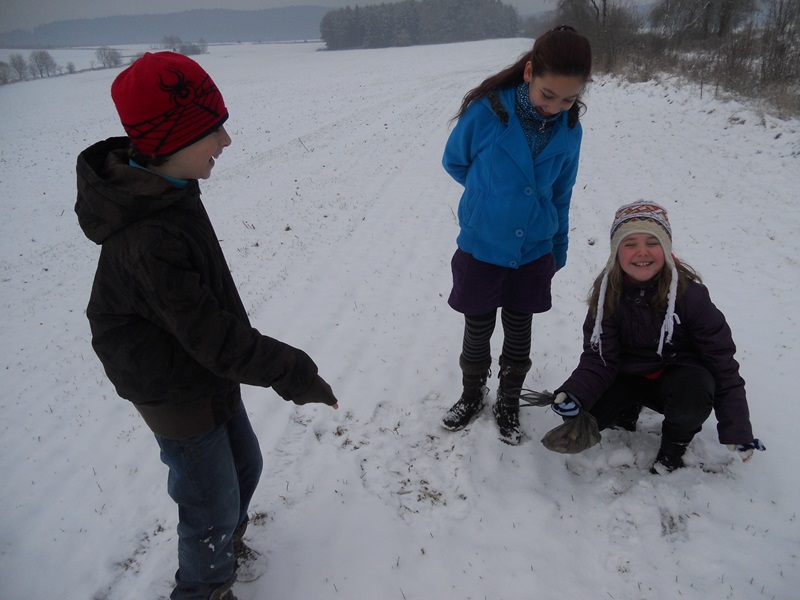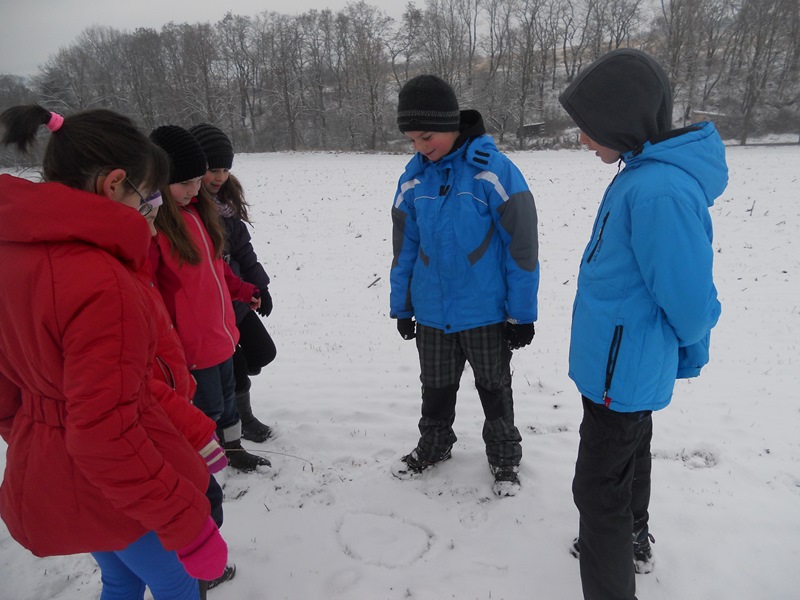 Konečně napadl sníh. Využili jsme pěkného počasí a vyrazili do polí a k lesu pozorovat stopy zvěře s tř. uč. H. Kozovou a vyučující výtvarné výchovy I. Bláhovou.