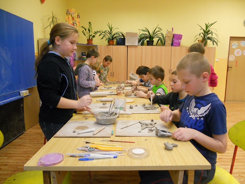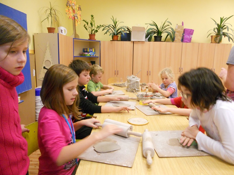 Čekala na nás práce s keramickou hlínou. Každý z nás, čtvrťáků, si došel pro svého prvňáčka a opět jsme pracovali společně. Mohli jsme si vybrat z nabídky - někdo dělal čerta, jiný anděla, zvoneček nebo rybu.