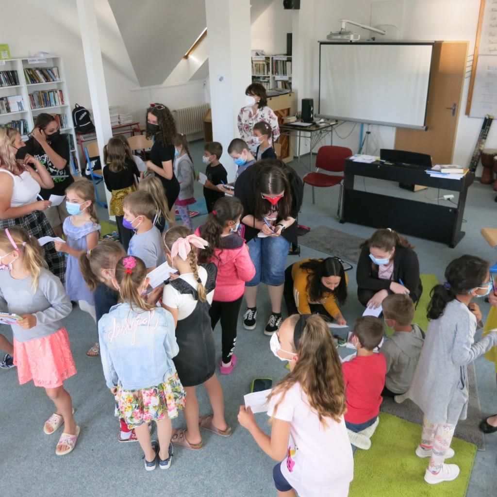 Nejdříve jsme se seznámili při hře bingo, během které jsme zjišťovali informace o sobě navzájem – například kdo má rád rajskou, kdo má sourozence, kdo rád čte knížky o zvířatech… Následně jsme se rozlosovali do dvojic podle pohádkových postav (např. Pat a Mat, Rumcajs a Manka…) tak, aby ve dvojici byl vždy jeden prvňáček a jeden deváťák.
