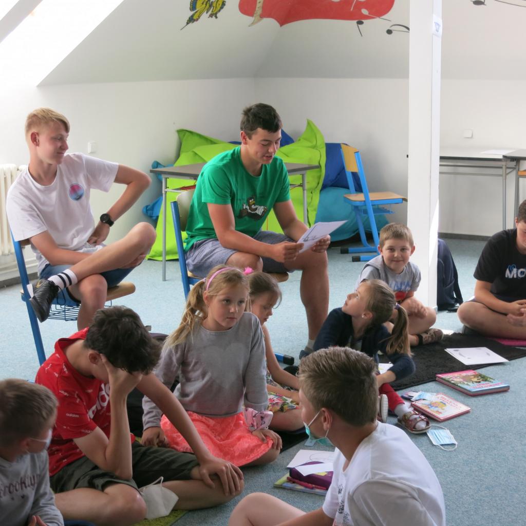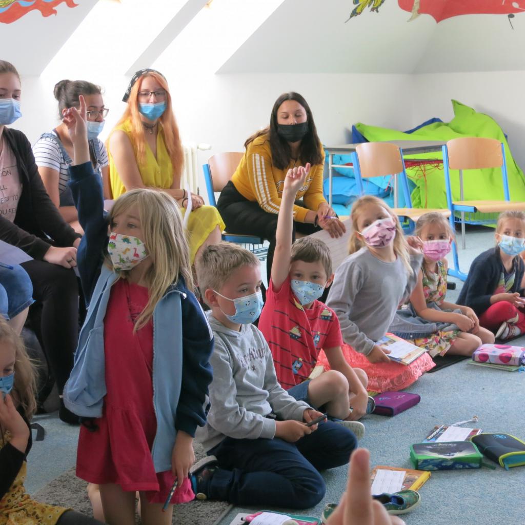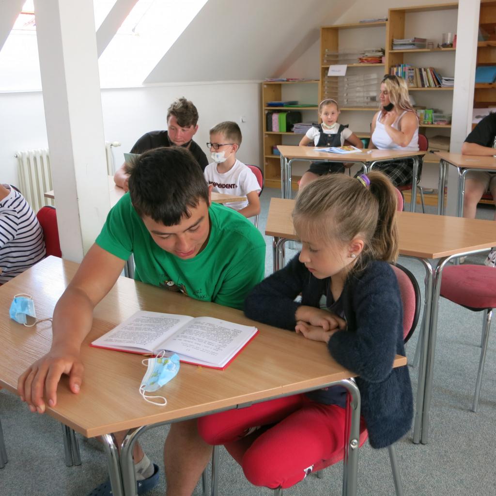 Hlavní aktivitou bylo čtení. Nejdříve prvňáček “svému” deváťákovi představil svoji knížku a pak z ní deáťák prvňáčkovi četl. Samozřejmě v další části byl čas také na čtení prvňáčků. Naším společným úkolem bylo vyplnit jeden ze sedmi pracovních listů, který se týkal knížky prvňáčků. Nejčastěji si dvojice zvolily dopis hlavnímu hrdinovi, ale hodně z nás se také rozhodlo pro pracovní list, do kterého jsme kreslili dárek, který bychom hrdinovi knížky poslali.
