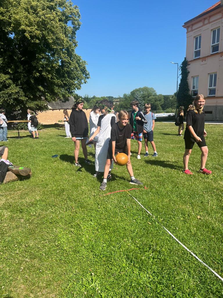 Začali jsme v osm hodin ráno na školní zahradě, kde byli žáci rozděleni do týmů a učitelé jim představili program celého dne. Hned také zadali první úkol. Týmy museli vytvořit živý obraz na téma Starověký Řím. Nejčastějším obrazem se stala „smrt Caesara“ a „gladiátorské souboje“, pouze jeden tým se oprostil od ostatních a předvedl „smrt Kleopatry“. Pak se týmy rozeběhly ke stanovištím, na kterých plnili další úkoly. V souboji na kladině museli předvést obratnost a sílu., svoji výdrž a rychlost ověřili v závodech „trakařů“, svoji sílu v hodu medicinbalem, šikovnost a důvtip při řešení „caesarovy šifry“ a hlavolamu a své vědomostí otestovali v dějepisném kvízu a matematickém příkladu. Pro umělce byly připraveny kreativní úkoly jako „napiš báseň“ a „namaluj obrázek“ na téma starověký Řím.