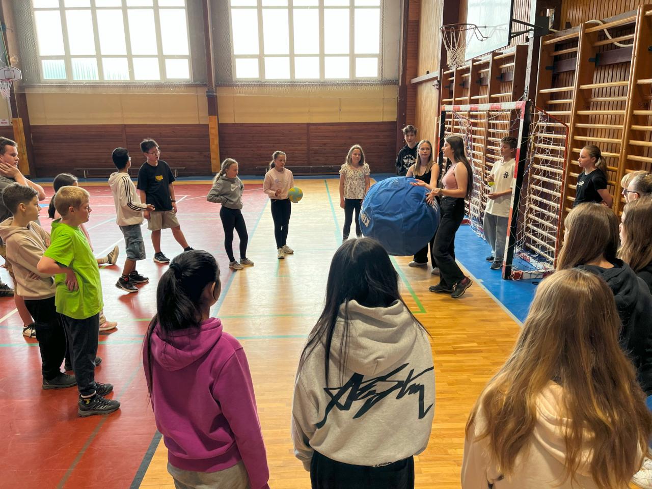 Na nádraží v Chotěšově na nás čekal žák z parlamentu z Chotěšova, který nás zavedl do školy. Po příchodu do školy jsme šli do školní jídelny. V jídelně jsme se rozdělili do skupin. V každé skupině byl někdo ze Staňkova a někdo z Chotěšova. Poté jsme dostali papírek, kam nám ostatní žáci psali vždy jen jedno písmeno našeho jména. Aby nám ho mohl napsat, tak jsme se s ním museli seznámit. Kdo měl celé jméno, mohl si ho ozdobit a vytvořil si z něho placku. Každá skupina měla svoje číslo. Postupně jsme chodili po škole a plnili velmi zajímavé úkoly. Prošli jsme zahradou, kde mají žáci venkovní učebny, dále jsme viděli jejich třídy, kuchyňku… Nakonec jsme se všichni sešli v tělocvičně, kde jsme si zahráli společně hru. Po tělocviku nás čekala svačina, při které jsme navštívili deváté třídy. Po svačině jsme pomáhali žákům vymyslet hudební den. Zkoušeli jsme různé aktivity - hra na boomwhackers… Po aktivitách nás čekal oběd. Po obědě jsme vyrazili ven, kde jsme zkoušeli KiVa hry a různé sportovní aktivity, do kterých se zapojili i učitelé. Nakonec jsme se ve venkovní učebně rozloučili.