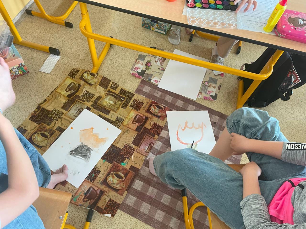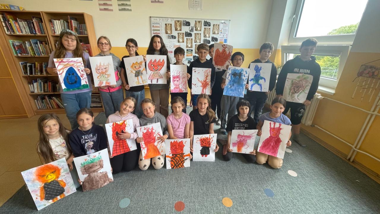 Na úvod hodiny jsme si společně prohlédli inspirativní díla umělců, kteří malují nohama nebo ústy. Děti obdivovaly jejich trpělivost, vytrvalost a talent. Poté si každý vybral jeden ze čtyř živlů – oheň, vodu, vzduch nebo zemi – a pustil se do tvoření.