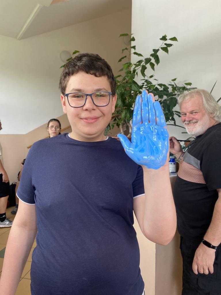 Na nabarvení ruky a samotný otisk jsme chodili po skupinách. Každý deváťák si nejdříve vybral barvu. S barvou a s obtiskem nám pomáhal pan učitel Schenk. Poté každý otiskl ruku na volné místo na zeď. Každým rokem ruce přibývají. Myslím si, že je to krásná tradice, která by měla nadále pokračovat.