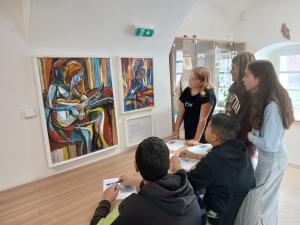 Při hodině výtvarné výchovy jsme se byli podívat v knihovně na výstavu obrazů akademického malíře Vladimíra Štěpána, který často pobývá v Krchlebech.