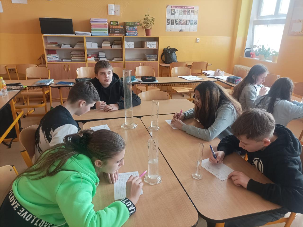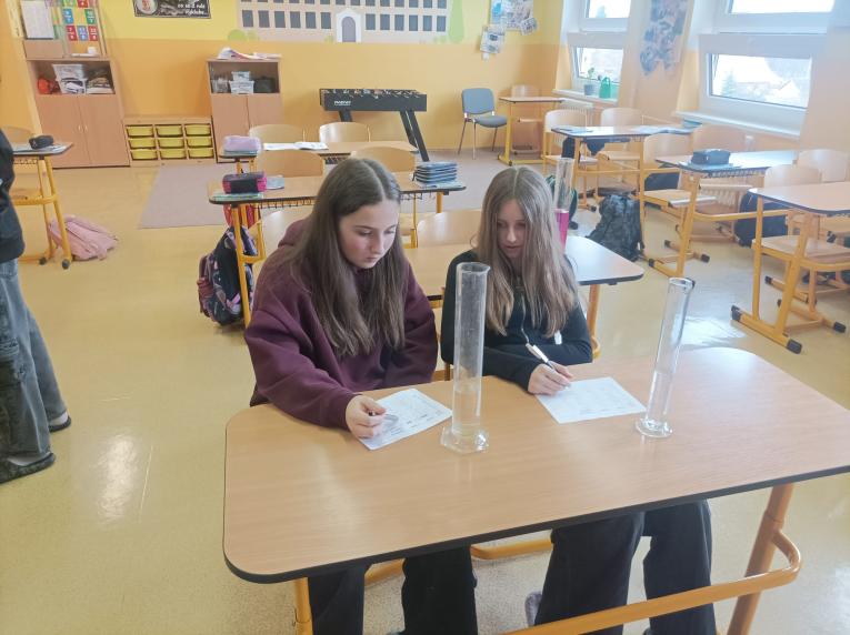 Na hodině fyziky v pátek 20. března jsme měřili vodu v odměrném válci. Dostali jsme 10 skleněných válců a měli jsme v nich odměřit vodu. Někteří ze spolužáků si také vyzkoušeli ochranný oblek, který si vědci oblékají jako ochranu proti škodlivým látkám. I když měl každý pracovat sám, pomohli jsme si. Panu učiteli Šobrovi děkujeme, byl to zajímavý zážitek.