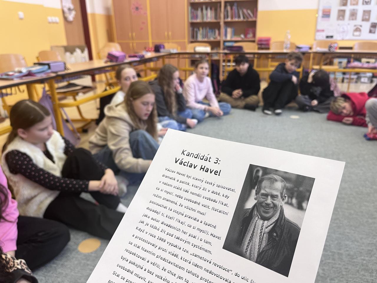Po sečtení hlasů nastalo velké překvapení. S drtivou převahou zvítězil kandidát číslo jedna. V tu chvíli učitel odhalil jména, která se za popisy skrývala: Adolf Hitler, Václav Havel a Winston Churchill.